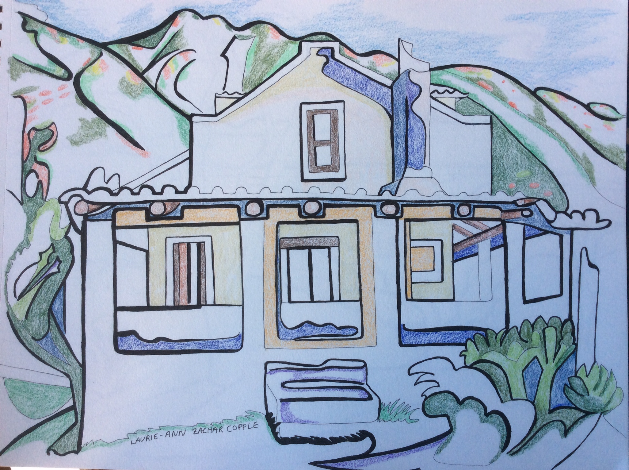 We were really excited by the journey into Robertson, as two of the long-term missionaries, Kathryn and Barbara, drove us from the Cape Town airport.  Robertson is two hours east of Cape Town through mountains, and valleys where many wineries are located.  We were given plenty of opportunities to rest, relax, journal and pray.  The area is farming country, and farmers are, well, quite easy-going!  We were housed in a mountain homestead that had no cellphone signal, no wifi and the electrical power was generated by solar panels on the roof. Our homestead was located in a beautiful mountain valley, where my drawing inspiration exploded.  I had already drawn two drawings in Mozambique.  I drew at least five more in this place! Part of my practical ministry was to draw for base leaders Johan and Marie Fourie. They kept a drawing that was commissioned of national flags in a field (Flag World, shown above) and another that I gifted them of the house that we stayed in (Pomegranate Homestead shown below).  Because we were a couple, we are again blessed with our own room (with a toilet and shower!).  Our team of ten all shared cooking duties and spent a lot of sharing and prayer together.  We were from Australia, England, Germany, Ukraine, South Africa and Canada.