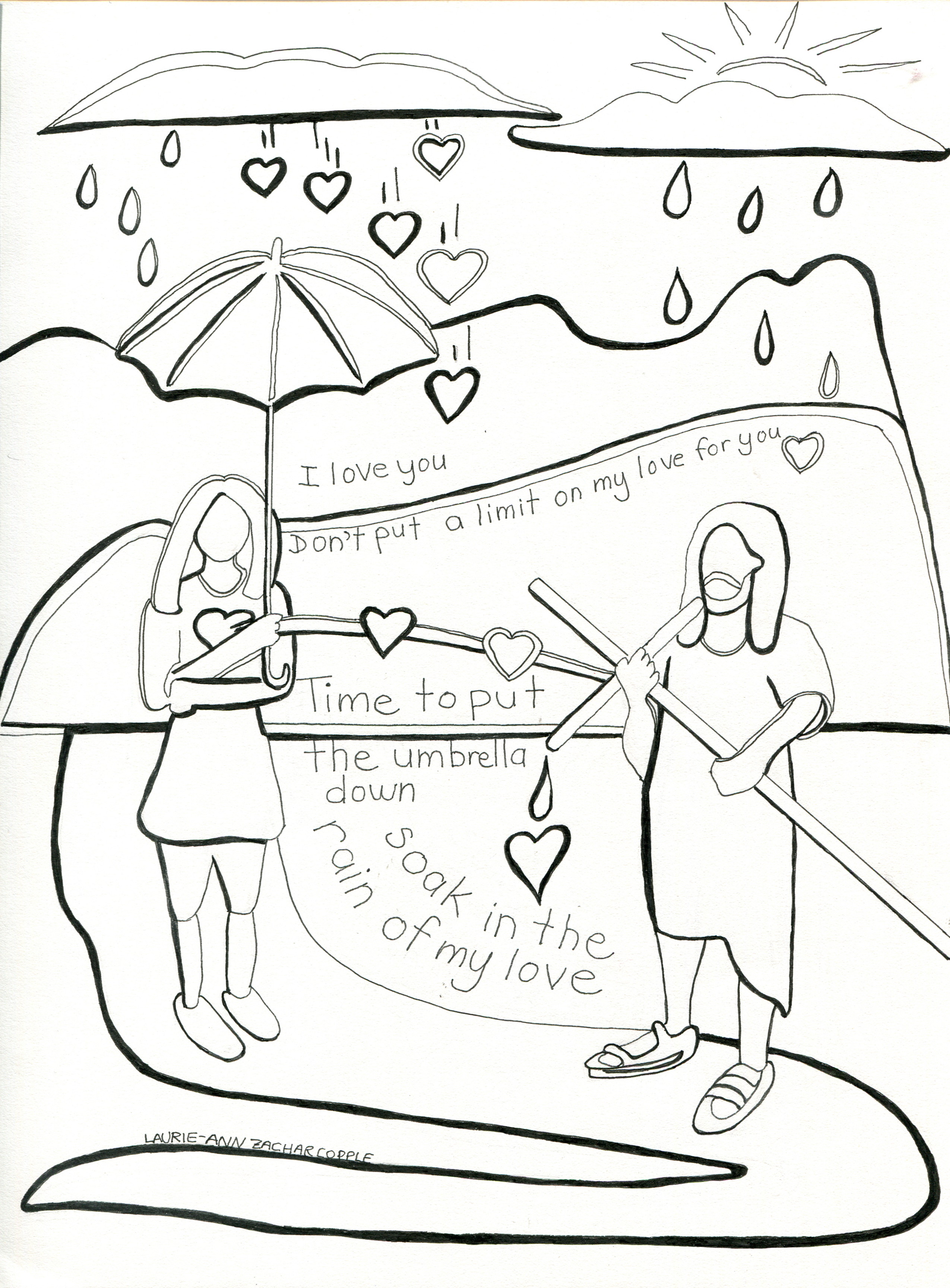 I recently drew a prophetic drawing while having a soaking and drawing session with our girls that we minister with through My Father’s House in Avian Park.  We listened to a series of beautiful soaking songs, and then all of us drew.  Even Tony drew.  The girls drew Christian symbols of hope, faithfulness, peace and love, as did Tony.  I drew a girl who raised her umbrella up against the rain.  Although the rain was really an abundance of hearts of God’s love, and the umbrella was limiting the flow of love into her heart and life.  Then I was led to draw Jesus, carrying his cross, and the love that flowed from him to the girl.   The word that came to me with the drawing was “I love you. Don’t put a limit on my love for you. Time to put the umbrella down.  Soak in the rain of my love.”
